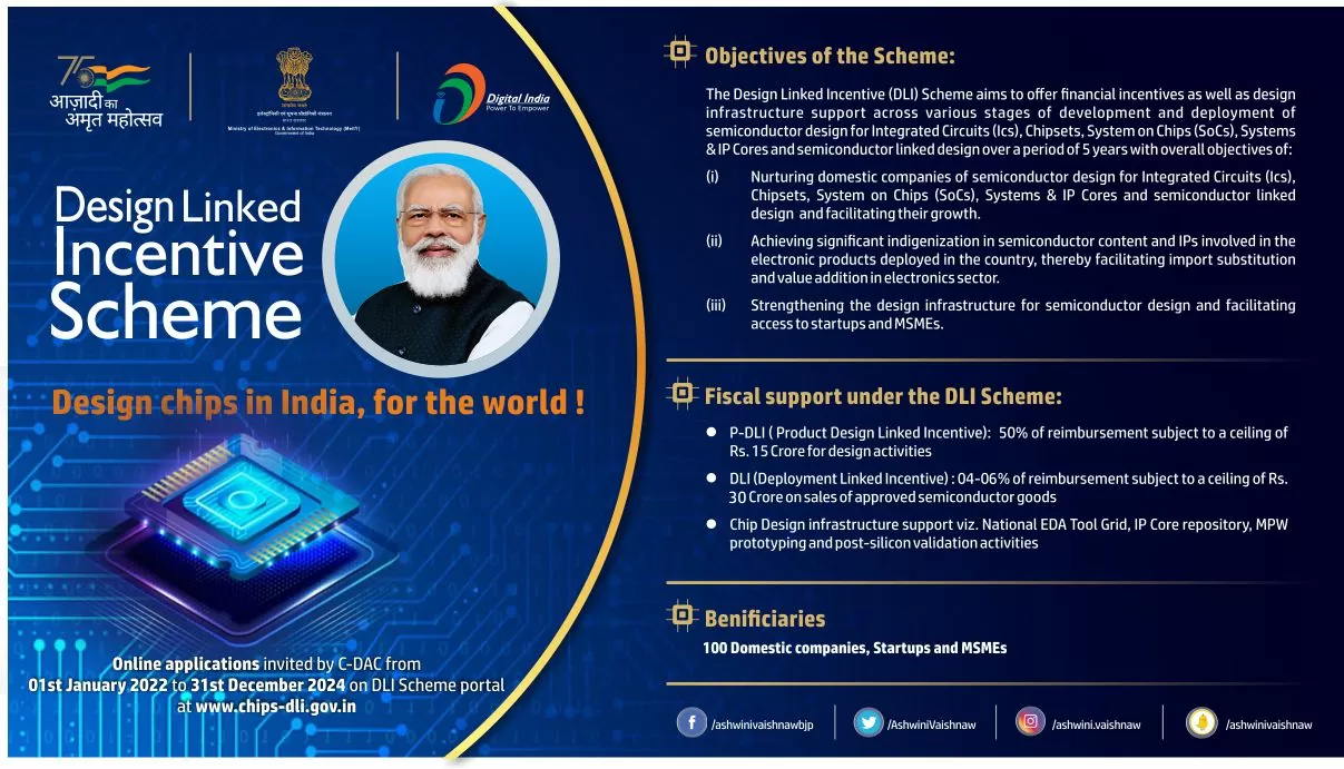 डीएलआई स्कीम जिसकी घोषणा दिसंबर में एमईआईटीवाई द्वारा की गई थी और इसके तहत घरेलू कंपनियों, स्टार्टअप और एमएसएमई को वित्तीय प्रोत्साहन और डिजाइन इंफ्रास्ट्रक्चर में मदद प्रदान करने का प्रावधान है। यह मदद अगले पांच साल के लिए एकीकृत सर्किट (आईसी), चिपसेट, सिस्टम ऑन चिप्स (एसओसी), सिस्टम और आईपी कोर्स और सेमीकंडक्टर लिंक्ड डिजाइन के विकास और डिप्लॉयमेंट के विभिन्न चरणों प्रदान की जाएगी।