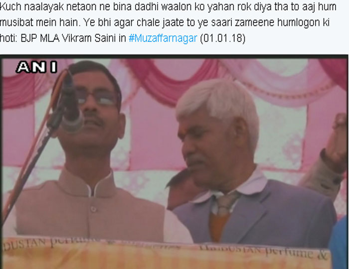 मुजफ्फरनगर। भारतीय जनता पार्टी के विधायक ने लंबे समय तक दंगे में झुलसे मुजफ्फरनगर में एक बार फिर आग उगली है। खतौली से विधायक विक्रम सैनी कल सैनी समाज प्रतिभा सम्मान समारोह में कहा कि देश का नाम हिंदुस्तान अर्थात हिंदुओं का देश। इतना ही नहीं उन्होंने कहा कि कुछ नेताओं ने ‘दाढ़ीवालों’ को रोक लिया था। इसी कारण आज आज हिंदुस्तान मुसीबत में है।