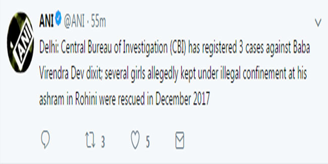 नई दिल्ली। फरार चल रहे ढोंगी बाबा वीरेंद्र देव दीक्षित पर शिकंजा कसता जा रहा है। बुधवार को केंद्रीय जांच ब्यूरो (सीबीआइ) ने बाबा वीरेंद्र देव के खिलाफ तीन मुकदमे दर्ज किए हैं। फिलहाल ढोंगी बाबा का अबतक कोई पता नहीं चल सका है। दिल्ली के रोहिणी स्थित बाबा वीरेंद्र देव के आश्रम से दिसंबर महीने में कई लड़कियों को छुड़ाया गया था, जिन्हें कई दिनों तक बंधक बनाकर कैद में रखा रखा गया था।
