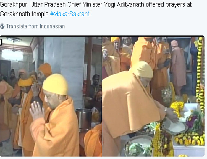 गोरखपुर। मुख्यमंत्री तथा गोरक्षनाथ पीठ के महंत योगी आदित्यनाथ ने आज तड़के मकर संक्रांति के पर्व पर गोरखनाथ मंदिर में महागुरु गोरखनाथ की पूजा-अर्चना की। उन्होंने ब्रह्ललीन महंत दिग्विजय नाथ एवं अवेद्यनाथ की भी पूजा की।