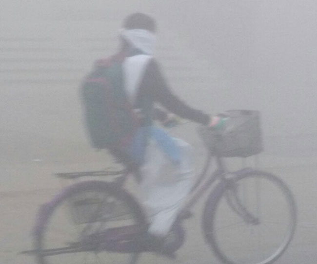 कुरुक्षेत्र में बृहस्पतिवार सुबह कोहरे के बीच स्कूल जाती छात्रा।