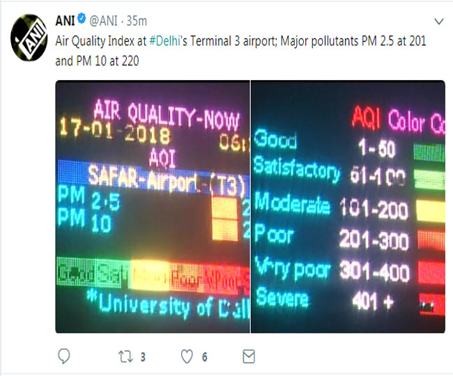 वहीं, दिल्ली एयरपोर्ट के इलाके में वायु गुणवत्ता सूचकांक के अनुसार प्रमुख प्रदूषक पीएम 2.5 की मात्रा 201 और पीएम 10 की मात्रा 220 दर्ज की गई। बता दें कि हवा में पीएम 2.5 की मात्रा 60 और पीएम 10 की मात्रा 100 होने पर ही हवा को सांस लेने के लिेए सुरक्षित माना जाता है।