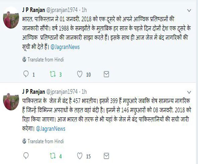 परमाणु प्रतिष्ठानों की जानकारी सामने आने के बात यह पता चला है कि पाकिस्तान की जेल में भारत के 475 नागरिक बंद हैं। इसमें 399 मछुआरे हैं जबकि शेष सामान्य नागरिक हैं, जिन्हें विभिन्न अपराधों के तहत वहां बंदी हैं। पाकिस्तान की जेल में बंद 399 मछुआरों में से 146 मछुआरों को आठ जनवरी, 2018 को रिहा कर दिया जाएगा। बता दें कि आज भारत भी यहां की जेल में बंद पाकिस्तानी नागरिकों की सूची जारी करेगा।