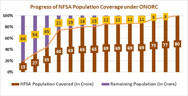 लाभार्थी केंद्रित इस उच्च प्रभाव वाले खाद्य कार्यक्रम का उद्देश्य सभी एनएफएसए लाभार्थियों को देश में कहीं भी अपनी खाद्य सुरक्षा के लिए आत्मनिर्भर होने के उद्देश्य से सशक्त बनाना है। यह योजना कोविड-19 महामारी के दौरान, विशेष रूप से प्रवासी लाभार्थियों और प्रत्येक एनएफएसए लाभार्थी के लिए एक फायदेमंद मूल्य वर्धित सेवा साबित हुई है। ओएनओआरसी ने लाभार्थियों को लॉकडाउन/संकट की अवधि के दौरान किसी भी स्थान से पूरी सुविधा के साथ रियायती खाद्यान्न का लाभ उठाने की सहायता प्रदान की है। योजना की शुरुआत के बाद से (अगस्त 2019 में), ओएनओआरसी के तहत लगभग 77.88 करोड़ पोर्टेबल लेनदेन दर्ज किये गए हैं।