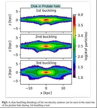उन्होंने निष्कर्ष निकाला कि हमारे काले पदार्थ मंडल (भुजाओं की ओर से गोलाकार) में सिमुलेशन के साथ-साथ देखी गई कई बकलिंग की घटनाओं से संकेत मिलता है कि अधिकांश बाधित आकाशगंगाओं में धुंधले पदार्थ मंडल की आकृतियाँ चिपटी हो सकती हैं (ऊपर से नीचे तक दबा हुआ) या गोलाकार हो सकती हैं।