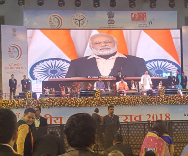नोएडा। ग्रेटर नोएडा के गौतमबुद्ध विश्वविद्यालय में आयोजित होने वाले 22वें नेशनल यूथ फेस्टिवल का उद्घाटन शुक्रवार को प्रधानमंत्री नरेंद्र मोदी ने वीडियो कॉन्फ्रेंसिंग के जरिए किया। उद्घाटन के बाद पीएम मोदी ने समारोह में मौजूद तकरीबन 5000 युवाओं को संबोधित किया। पांच दिवसीय नेशनल यूथ फेस्टिवल (12-15 जनवरी) तक चलेगा। इससे पहले योगी आदित्यनाथ उद्घाटन स्थल पर बने मंच पर आए और उन्होंने युवाओं का अभिवादन स्वीकार किया।