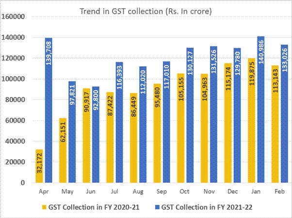 फरवरी 2022 के महीने के लिए राजस्व पिछले साल के इसी महीने में संग्रह किए गए जीएसटी राजस्व से 18 प्रतिशत और फरवरी 2020 में जीएसटी राजस्व से 26 प्रतिशत अधिक है। इस मास के दौरान, वस्तुओं के आयात से प्राप्त राजस्व 38 प्रतिशत अधिक रहा और घरेलू लेन-देन से प्राप्त राजस्व (सेवाओं के आयात सहित) पिछले वर्ष के इसी महीने के दौरान इन स्रोतों से प्राप्त राजस्व की तुलना में 12 प्रतिशत अधिक है।