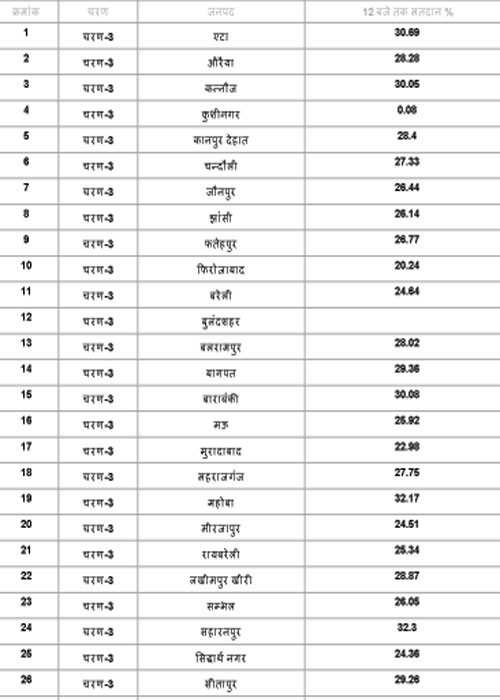 प्रदेश के तीसरे चरण में 94 लाख मतदाता 28135 प्रत्याशियों की किस्मत का फैसला करेंगे। मतदान सुबह साढ़े सात बजे से शुरू हो गया है जो कि शाम पांच बजे तक होगा।दूसरे चरण के मतदान के दौरान मतदाता सूची के साथ ही ईवीएम में खराबी के कारण इस चरण में जिला प्रशासन की टीमें किसी भी गड़बड़ी से निपटने को पूरी तरह से मुस्तैद हैं।